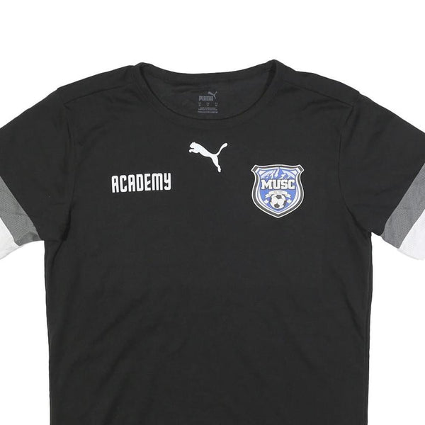 This mens PUMA T-shirt features a striking black base with grey and white colour-blocked sleeves adding a modern sporty touch. The front showcases the word "ACADEMY" in white print accompanied by the iconic Puma logo and a detailed club-style crest with "MUSC" and a football design. Crafted from lightweight polyester fabric, it offers excellent moisture-wicking and breathability for active wear.