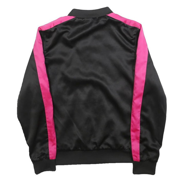 This women's PUMA jacket features a striking black base with bold pink accents along the shoulders and sleeves. The sleek PUMA cat logo in pink is visibly branded on the chest, offering unmistakable sporty style. It has a full zip fastening down the front and a classic stand-up collar.