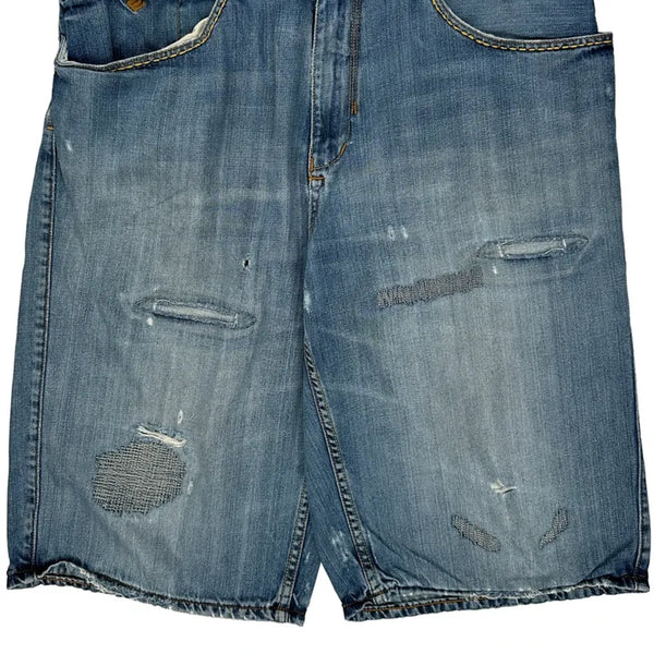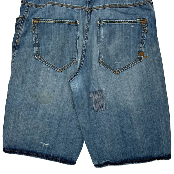 Distressed Denim Shorts With Visible Patches And Wear Marks.
