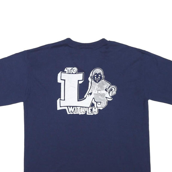 This men's T-shirt from Russell Athletic features a deep navy blue colour with a bold white graphic print on the back showing text and a character illustration. The front is plain, allowing the striking back design to stand out.