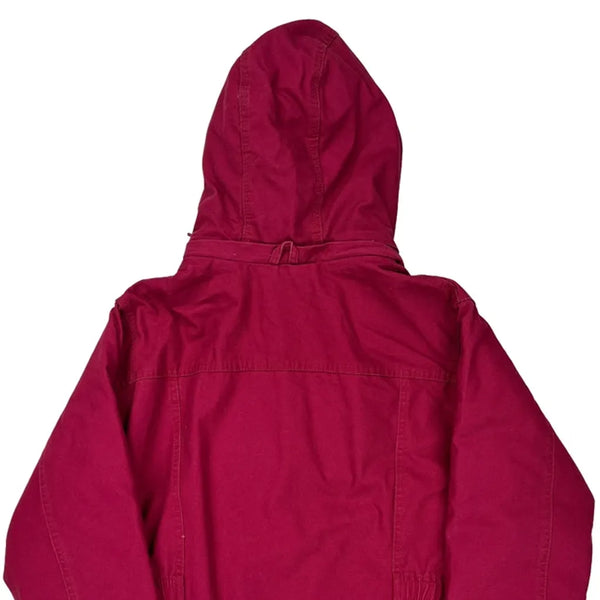 Red Jacket With Checked Lining, Multiple Pockets, And Hood.