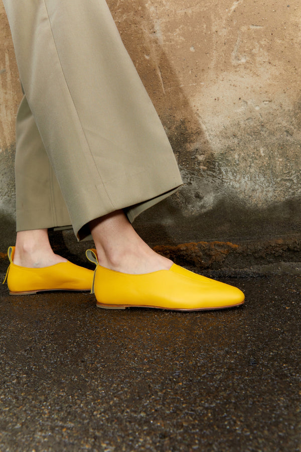 Calfskin yellow leather ballerinas flats with square toe and elastic closure.
