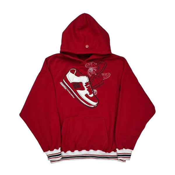 Red Hoodie With Sneaker Graphic Print, Some Visible Pilling