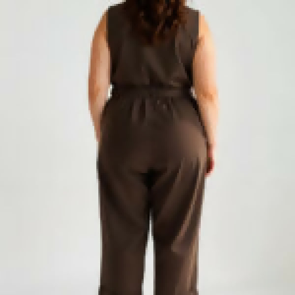 A timeless wardrobe staple, this dark brown jumpsuit features a figure-enhancing tie-up belt, practical side pockets, and a seamless back zip closure. Its sleeveless design and breathable linen fabric make it perfect for all-day wear, embodying effortless charm and understated luxury.