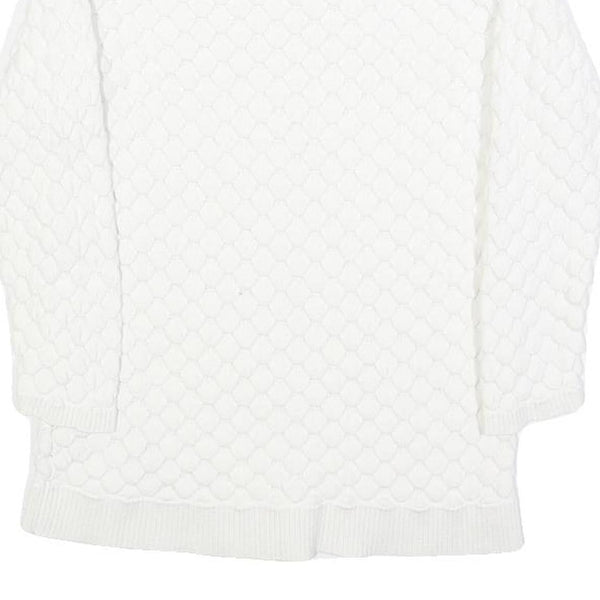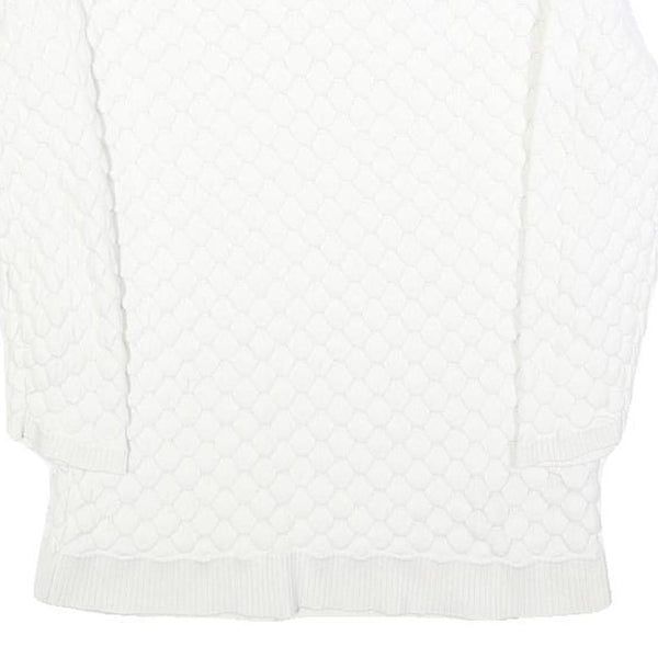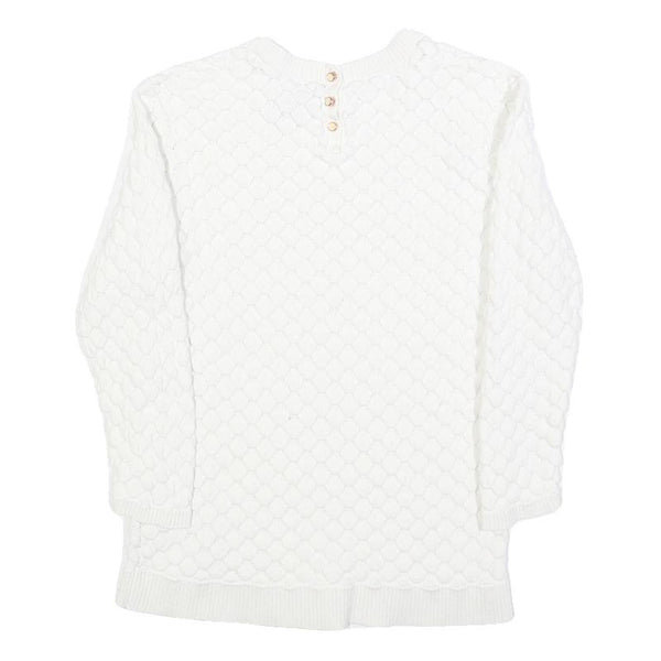This Ted Baker womens jumper is a classic white shade with a subtle textured pattern throughout. It features a round crew neckline and long sleeves with ribbed cuffs and hem. The back sports three elegant gold-tone buttons near the neckline for added detail.
