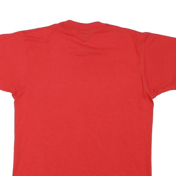 Designed with a crew neckline and short sleeves, this T-shirt offers a relaxed fit suitable for casual styling. The plain red back complements the simple graphic front. The cotton blend fabric delivers breathable wear, perfect for layering or standalone use.