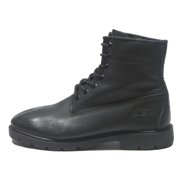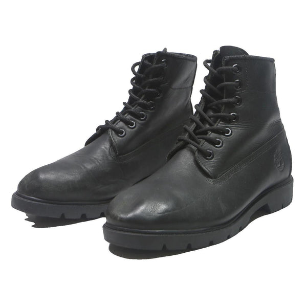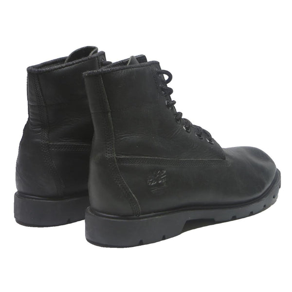 These Timberland boots feature a sleek black leather upper with a smooth, polished finish. The classic ankle height design is complemented by the embossed Timberland tree logo on the heel, adding subtle branding. The sturdy lacing system and padded collar offer supportive comfort and secure fit.
