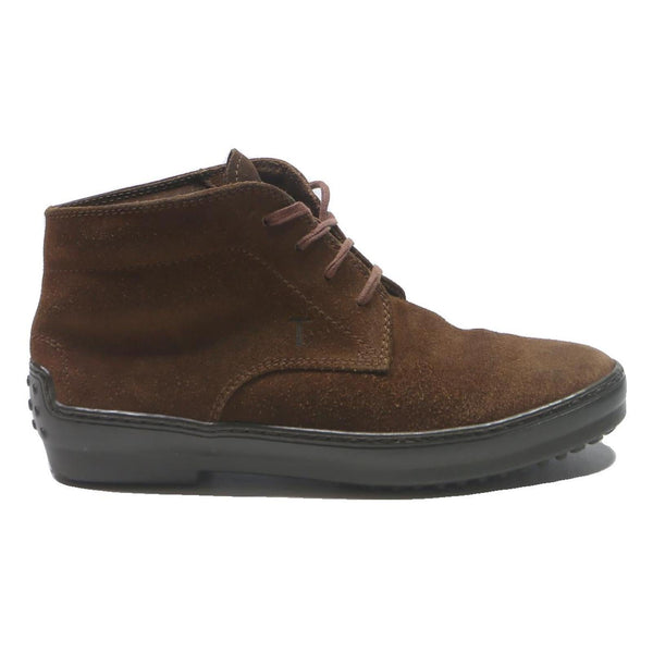 These Tods Mens ankle boots feature a rich brown suede upper with subtle stitching and a clean, elegant silhouette. The soft suede provides a refined texture, complemented by matching brown laces and a distinctive 'T' logo embossed on the side panel, highlighting the brand's attention to detail.