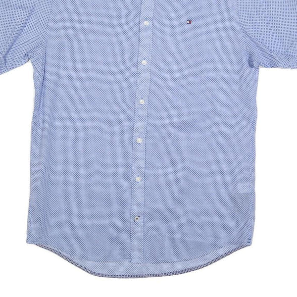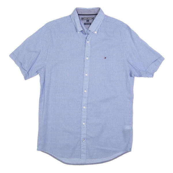 This Tommy Hilfiger mens shirt showcases a subtle blue micro-pattern design across its linen blend fabric, offering a stylish yet breathable wear ideal for warmer months. The shirt features a traditional button-down collar and a neat button front, with the iconic Tommy Hilfiger flag logo embroidered discreetly on the left chest, signifying quality and brand prestige.