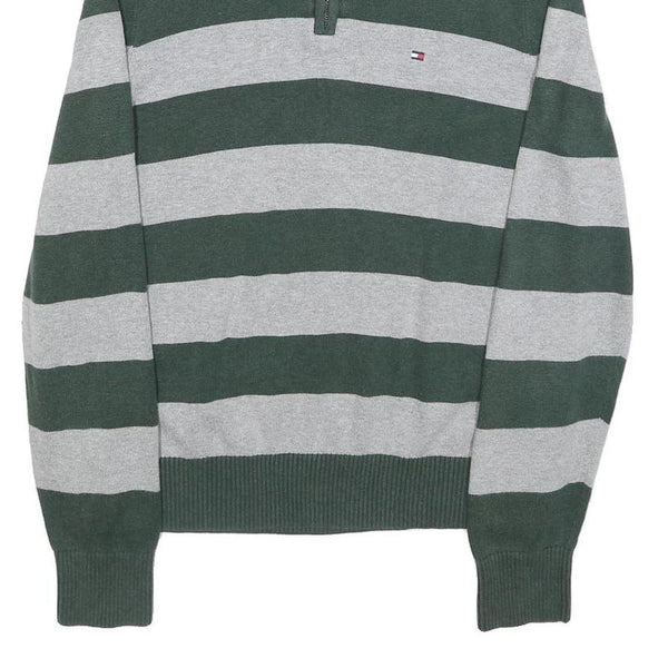 TOMMY HILFIGER Mens Green & Grey Patterned Jumper 1/4 Zip Crew Neck Cotton M