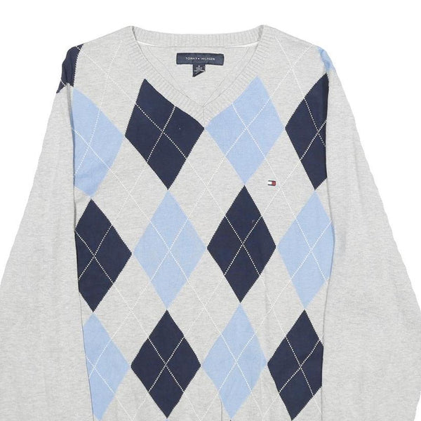 TOMMY HILFIGER Mens Grey Blue Argyle V-Neck Cotton Jumper M Classic Pre-Loved
