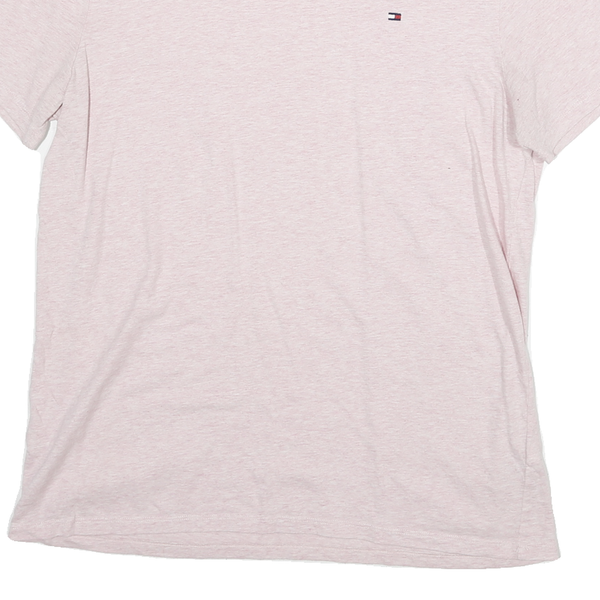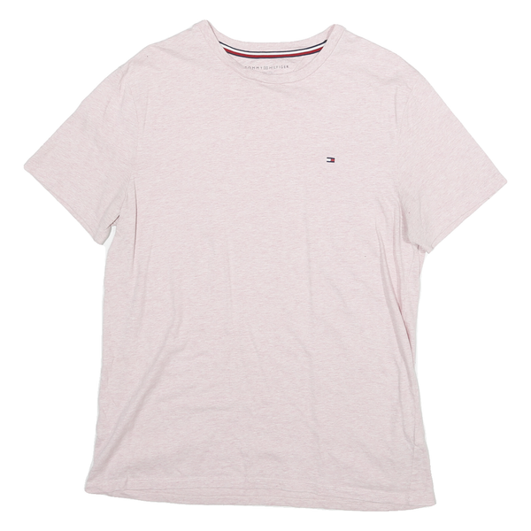 This Tommy Hilfiger mens T-shirt is a soft pink colour with a subtle heathered effect. It features the classic Tommy Hilfiger flag logo embroidered on the left chest, discreet yet iconic. The T-shirt has a crew neck and short sleeves, offering a timeless, versatile style.