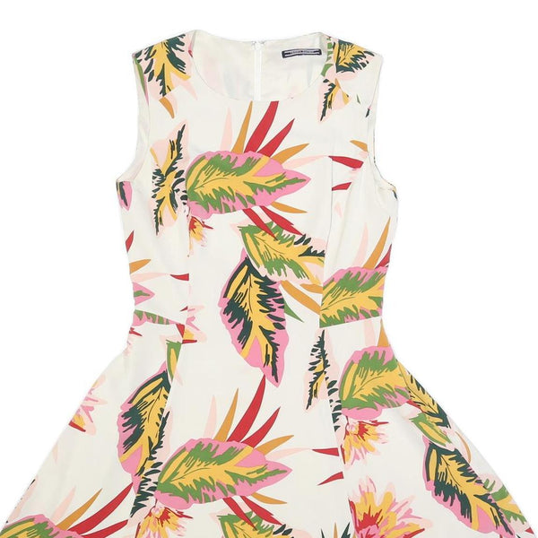 This Tommy Hilfiger womens dress features a vibrant floral pattern in shades of green, pink, yellow and red on a white background. It has a sleeveless design with a round neckline and a flared fit & flare silhouette that accentuates the waist for a flattering shape.