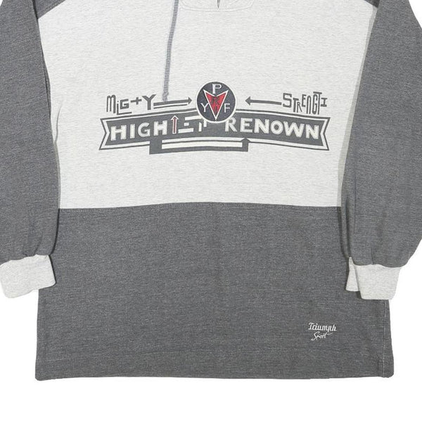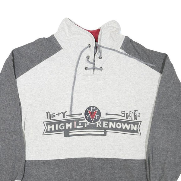 This men's sweatshirt from Triumph features a stylish grey and cream colour block design with a printed graphic on the front that reads "HIGH RENOWN" alongside artistic texts and a circular emblem. The sweatshirt has a unique crew neck style with a lace-up detail at the neckline adding extra character to the design.