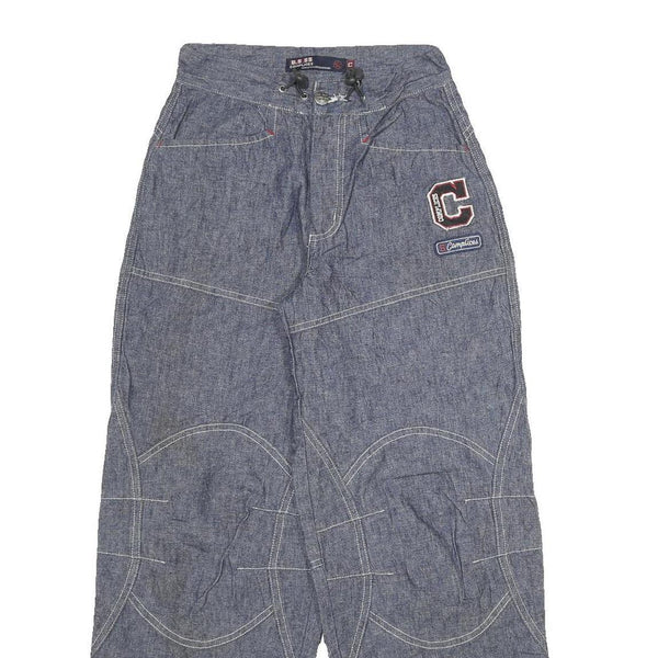 These US 55 mens jeans feature a relaxed fit in a blue denim-look cotton blend fabric. The jeans showcase detailed stitched panel designs and prominent contrast white stitching that accentuates the casual style. A bold embroidered patch with the letter "C" adds sporty branding flair to the front right leg.