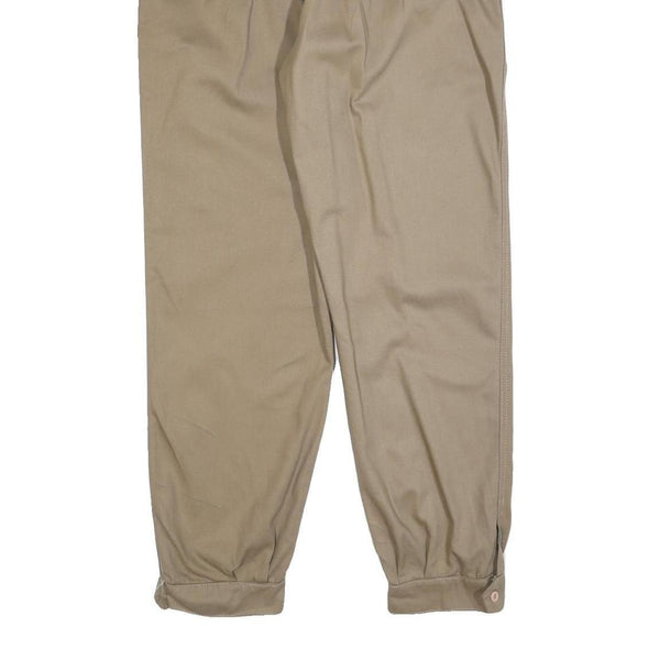 These womens trousers come in a neutral beige shade crafted from a polyester blend fabric. Featuring a relaxed fit with a zip closure, they offer ease and comfort for daily wear. The trousers have a tapered leg style gathered slightly at the cuff with button fastenings, creating a subtle, tailored look.