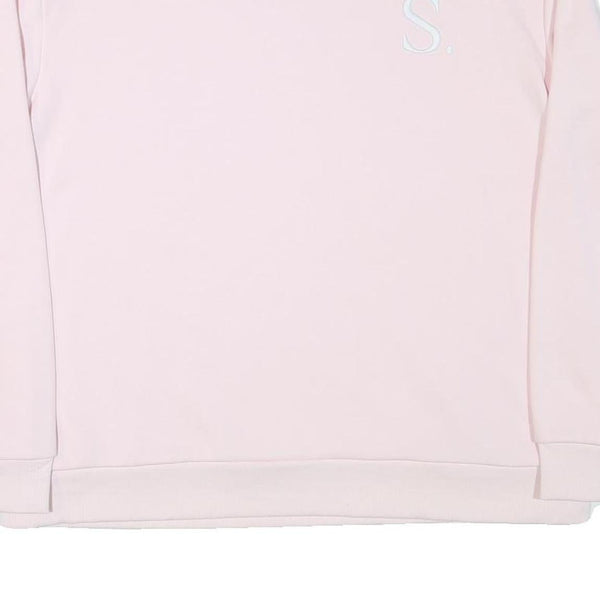 This womens sweatshirt features a soft pink colour with a subtle white graphic print on the chest for a stylish touch. Made from a smooth polyester blend jersey fabric, it offers a lightweight and comfortable feel perfect for everyday wear.