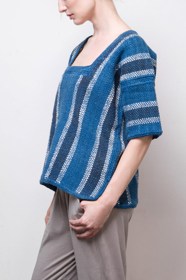 ARZÉ's hand woven organic cotton top feels and looks so chic. The color combination of indigo, white and navy combine perfectly to make a great woven.