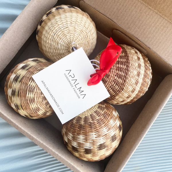 These boho Christmas baubles are made of strong and sustainable Iraca Palm fibers. 100% Hand woven and beautifully textured, Lightweight balls that won't break. Diameter: 3"