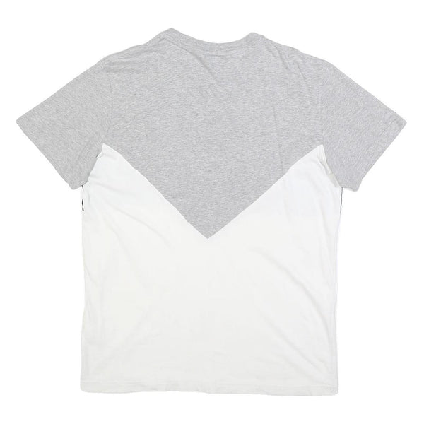 This Adidas mens T-shirt features a distinctive colour block design with grey on the upper chest extending into a V-shape, black band across the midsection, and white lower body. The Adidas Trefoil logo is prominently printed in white at the centre front, confirming its classic branding. The back mirrors the front's tri-colour scheme with the grey section forming a V shape downward.