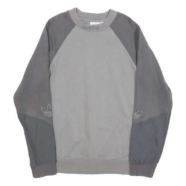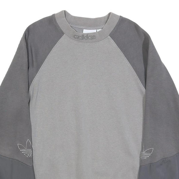 This Adidas mens sweatshirt features a grey colour palette with a contrasting darker grey on the sleeves from elbow down to cuff, and lighter grey on the body and upper sleeves. The crew neckline is ribbed with an embroidered Adidas logo on the front collar. The Adidas trefoil logo appears in white outline on the lower sleeve area. It presents a minimalist sporty design with subtle branding.