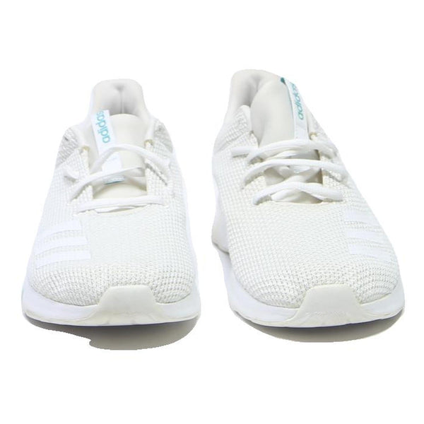These Adidas trainers feature a clean white synthetic mesh upper with subtle aqua accents on the midsole and Adidas branding on the tongue. The design incorporates the iconic three stripes on the side for classic brand recognition. The cushioning sole provides comfort and support for various activities.
