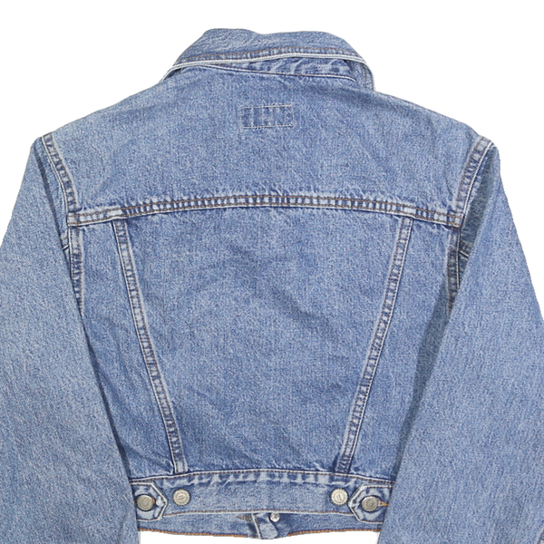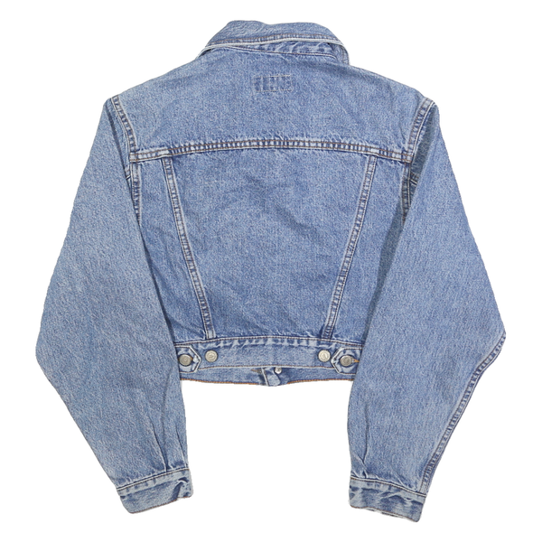The cropped fit and medium length sleeves create a flattering silhouette ideal for casual layering. The fabric is durable cotton denim with visible stitching details enhancing its classic charm. This versatile jacket pairs perfectly with everyday looks from jeans to skirts, adding effortless cool to your wardrobe.