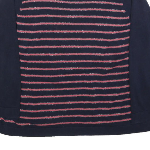 This Bonmarche womens jumper features a classic navy blue base with horizontal pink stripes across the front and back panels, accented with a round neckline trimmed in pink. The subtle sparkle within the pink stripes adds a refined yet understated decorative touch. The long sleeves and simple hemline contribute to its clean silhouette.