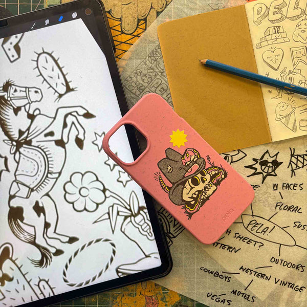 Embrace the wild west with the Snakebite Phone Case from the exclusive Pela x Cam Miller Artist Series Collection! Featuring a bold and edgy design of a cowboy hat-wearing skull entangled with a fierce rattlesnake, this case brings a punch of rebellious charm to your everyday adventures. The vibrant bubblegum pink background adds a playful contrast to the gritty artwork, making it a standout piece for those who dare to be different. Perfect for thrill-seekers and art lovers alike, the Snakebite case is your ultimate accessory for a fearless and stylish look. Ride into the sunset with a touch of danger and a whole lot of attitude!