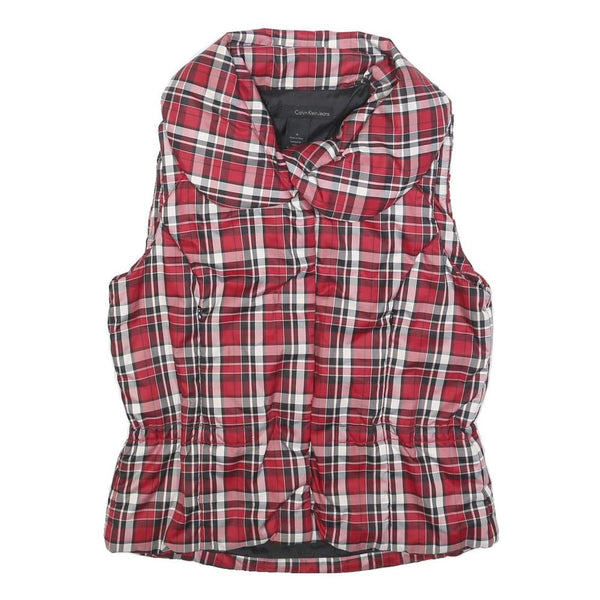 This womens puffer jacket from Calvin Klein Jeans showcases a striking red and white checked pattern with black accents, creating a bold, classic look. It features a zip closure and a high collar that adds to its stylish yet practical design. The jacket is sleeveless, perfect for layering.