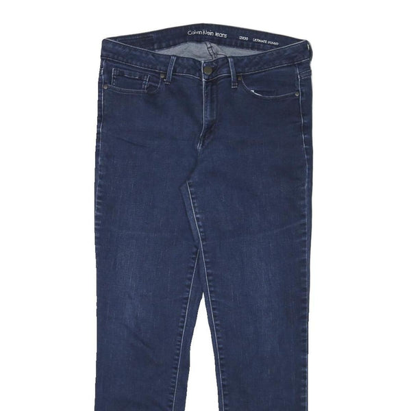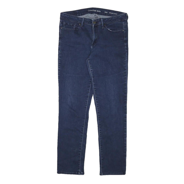 These Calvin Klein Jeans for womens feature a deep blue denim colour with subtle fading for a classic look. The jeans have a clean, minimalist appearance with traditional five-pocket styling and a small Calvin Klein branding on the inner waistband. They fasten with a zip and button closure and show tonal stitching throughout.