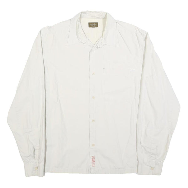 This Calvin Klein mens shirt features a crisp white colour in a plain design, offering a clean and versatile look. It has a classic button closure down the front and a pointed collar for a traditional shirt silhouette. The shirt also includes long sleeves with buttoned cuffs and a small subtle Calvin Klein logo tab on the chest pocket, adding understated branding.