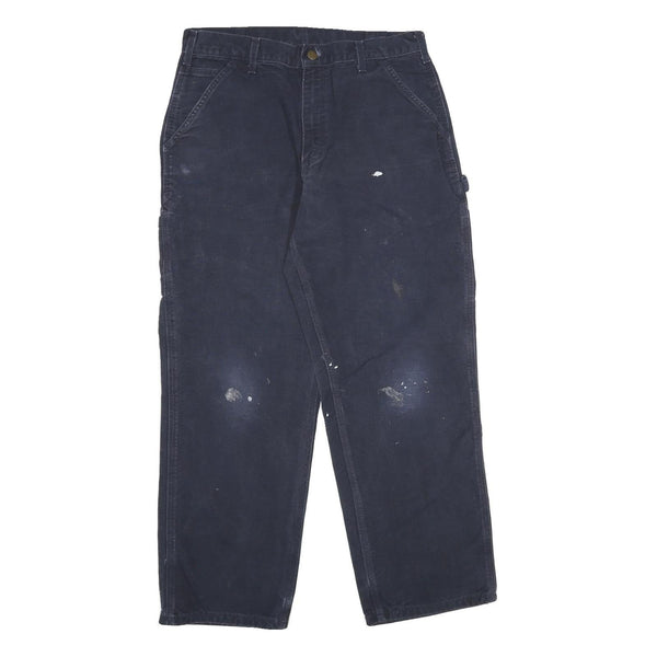 These CARHARTT trousers feature a deep navy colour with a classic straight leg fit, designed for durability and practicality. The cotton fabric offers a comfortable yet robust feel suitable for workwear and casual use. There are visible paint splatters and minor marks on the front, adding a rugged, worn-in character.