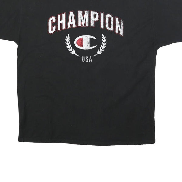 This Champion mens T-shirt features a bold black cotton blend fabric accented with a prominent graphic logo across the chest. The front displays the word "CHAMPION" in large distressed white and red lettering, accompanied by the Champion emblem and the text "USA" beneath, surrounded by laurel leaves for a sporty look. The sleeve sports a small woven Champion logo patch.