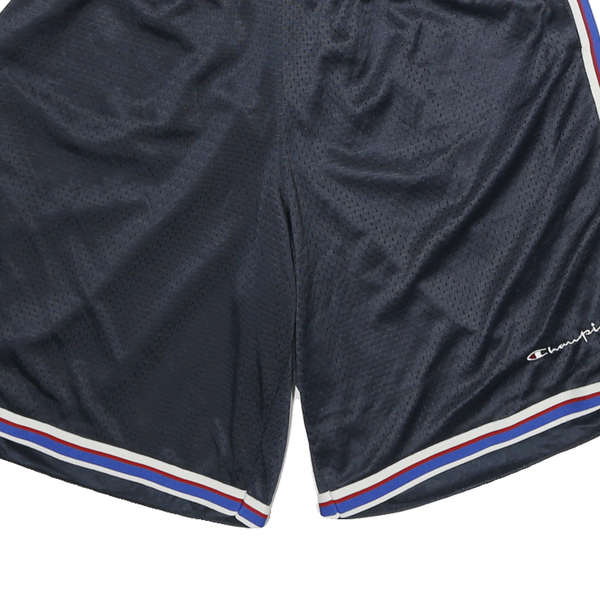 These navy blue mens shorts from Champion feature a sporty design with contrasted trim in white, red, and blue along the side seams and hem. The shorts are made from a lightweight polyester blend with a breathable mesh texture that offers comfort and moisture-wicking properties. They have an elasticated waistband for a secure and adjustable fit.