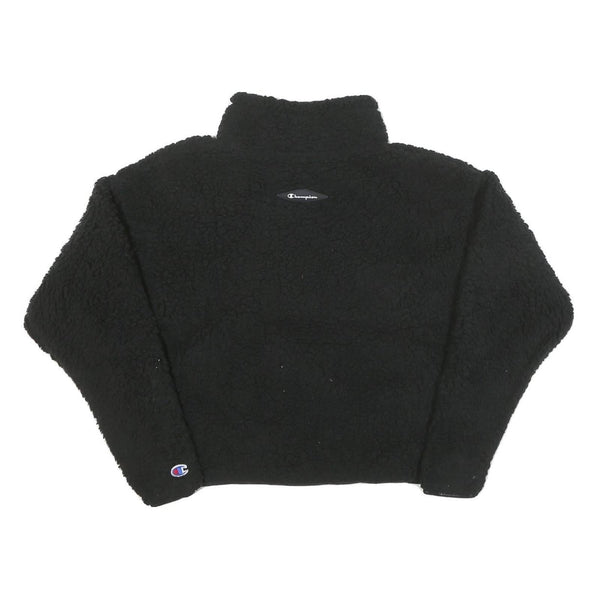 This womens Champion pullover jumper is crafted from a soft polyester blend fleece in black, offering warmth and comfort with a plush, chunky texture. The front features the iconic Champion script logo embroidered in white on the chest, complemented by the smaller Champion 'C' logo on the cuff and subtle branding on the back collar.
