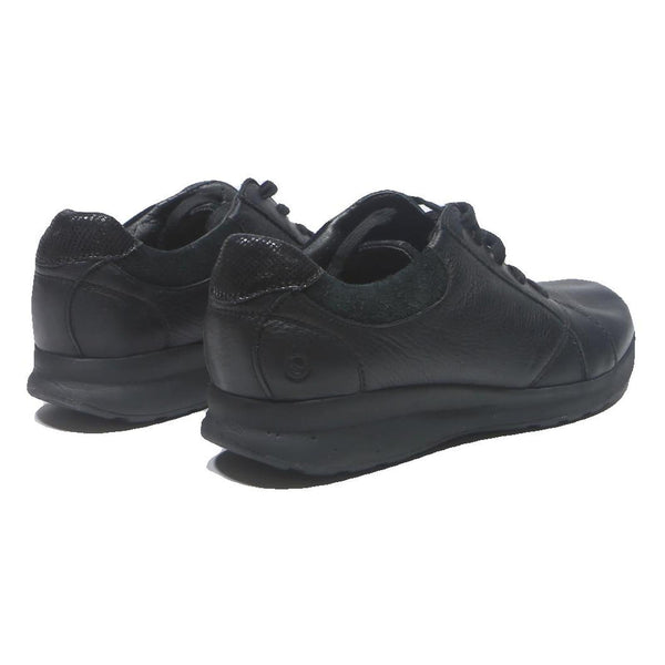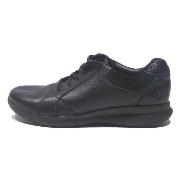 These Clarks womens trainers feature a sleek black leather upper with a smooth and polished finish. The lace-up design provides a secure fit, complemented by subtle stitched detailing and a lightly padded collar for ankle comfort. The sole is black with a sturdy grip ideal for everyday wear.