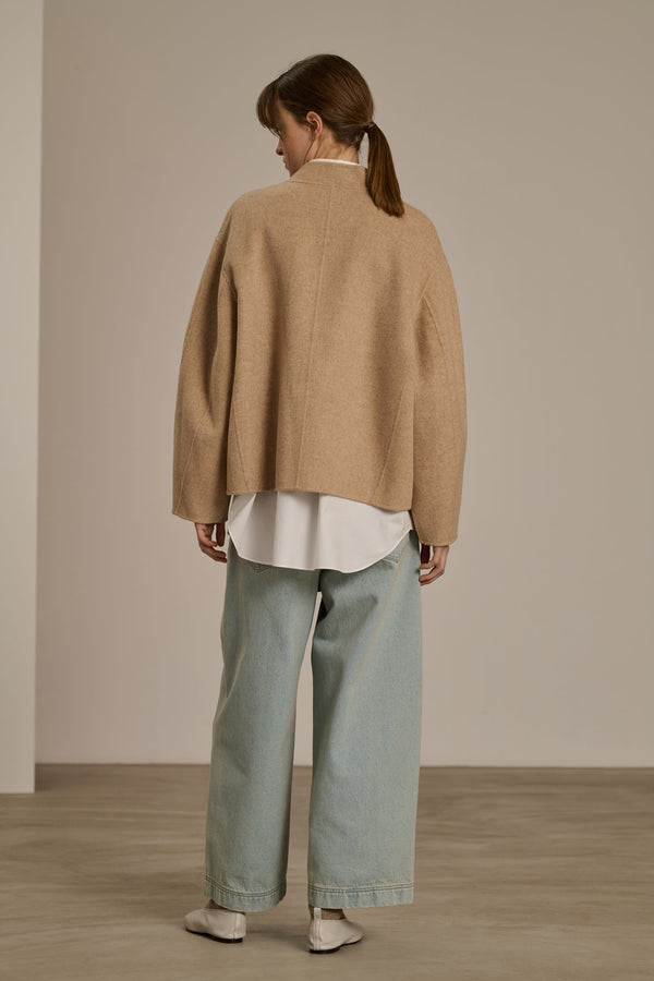 - Stand-up collar, asymmetrical overlap and semi-concealed buttoned fastening