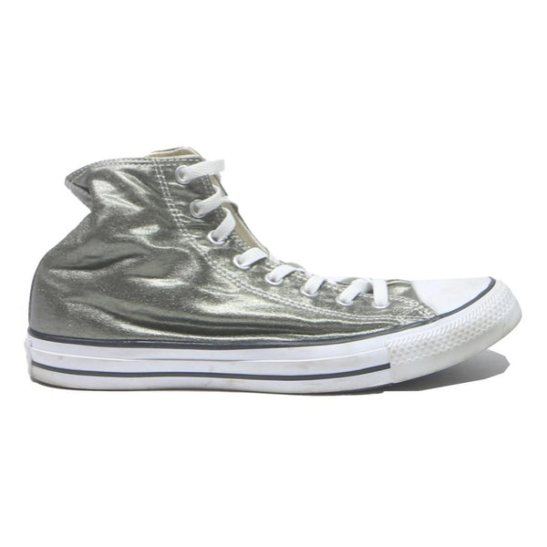 These Womens Converse Chuck Taylor All Star High Top Trainers feature a striking silver canvas upper with a glossy finish. The design includes the iconic white rubber toe cap and white laces that complement the metallic sheen, offering a bold yet timeless look.