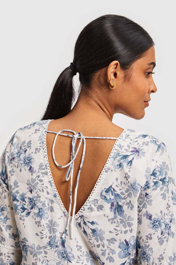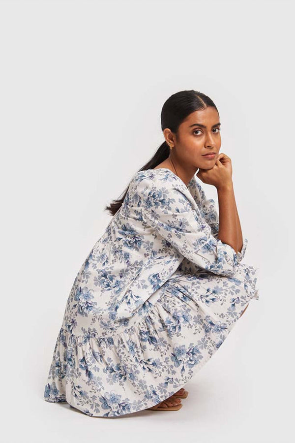 A flowy, relaxed poplin dress that has a v-neck and three quarter sleeves with pockets.