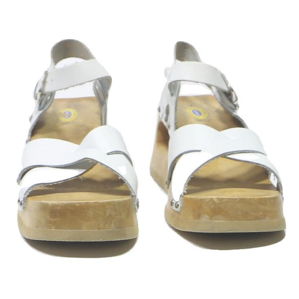 These DR SCHOLLS womens sandals feature white leather straps with silver-tone stud detailing and a wooden platform sole with a distinctive cut-out design. The ankle strap includes a silver buckle for an adjustable fit. The sandals combine practicality with stylish flair for warm weather wear.
