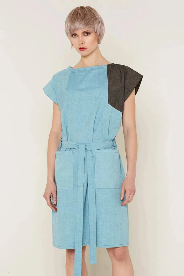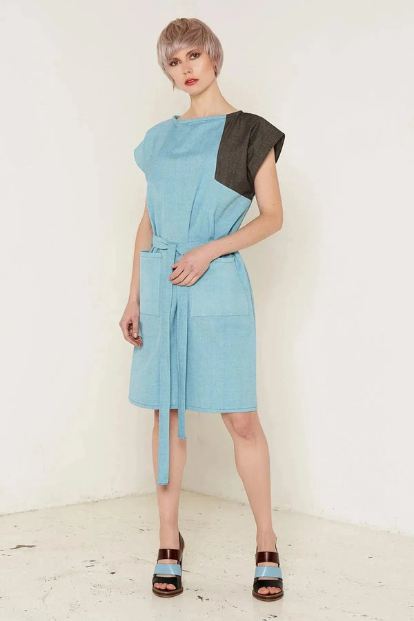 The dress has pockets at the hips and an adjustable belt to draw in the waistline, creating a gorgeous silhouette. It is available in two different colours: a smart, elegant black, and a vivid aqua, both of which are finished with a contrasting grey detail on one shoulder.