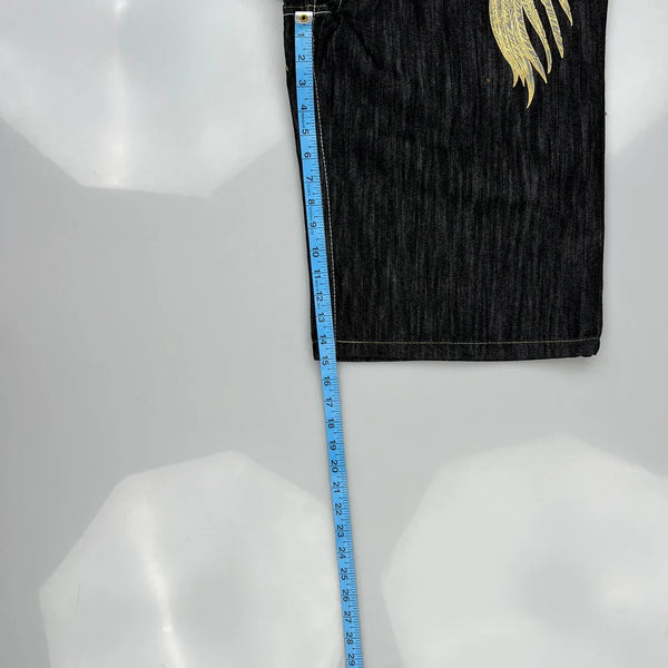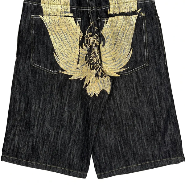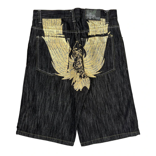Dark Wash Denim Shorts With Gold Graphic Design.