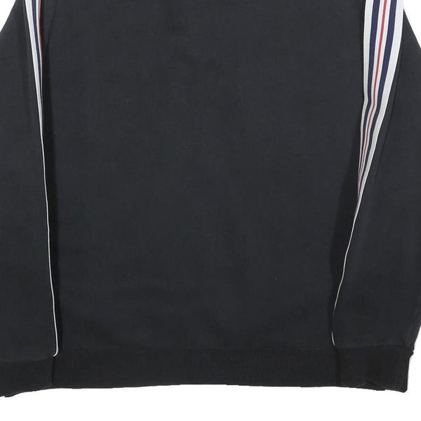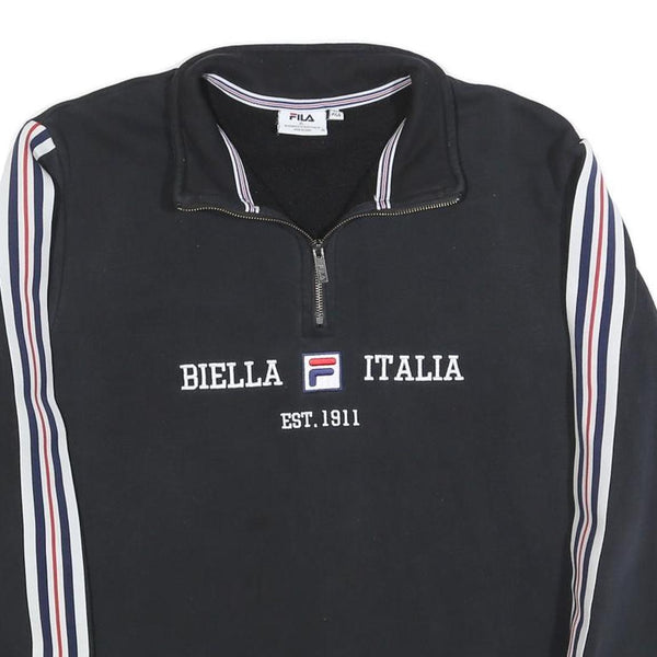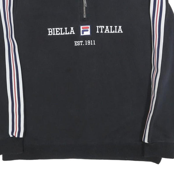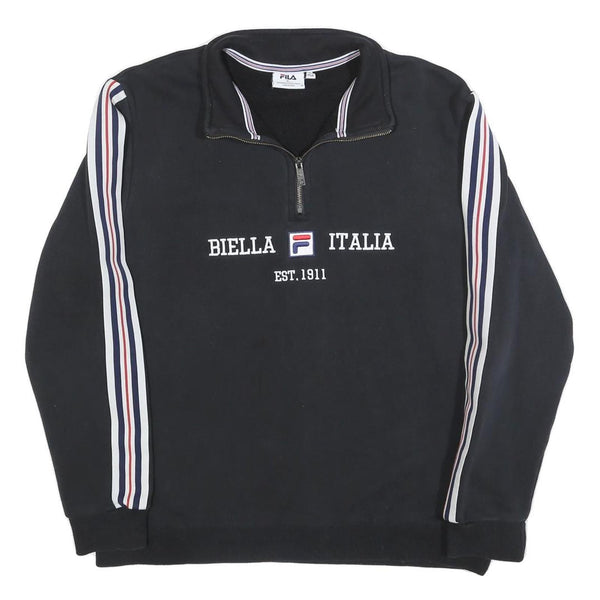 This men's FILA sweatshirt features a classic black body with white, navy, and red stripes running down the length of both sleeves, creating a sporty and stylish look. The front showcases embroidered text "BIELLA ITALIA" with the FILA logo in the centre and "EST. 1911" underneath, emphasising the brand heritage. The half-zip collar adds a functional and fashionable touch while allowing for adjustable comfort.