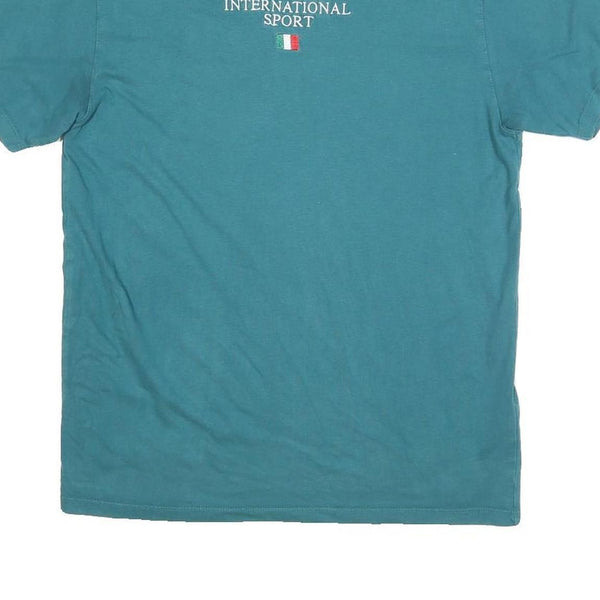 This FILA mens T-shirt comes in a soft blue shade with a small embroidered front graphic featuring the FILA logo, the words International Sport, and an Italian flag motif underneath. The design is subtle and centred on the chest, providing a classic sporty touch.