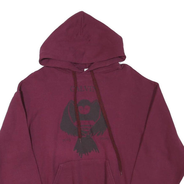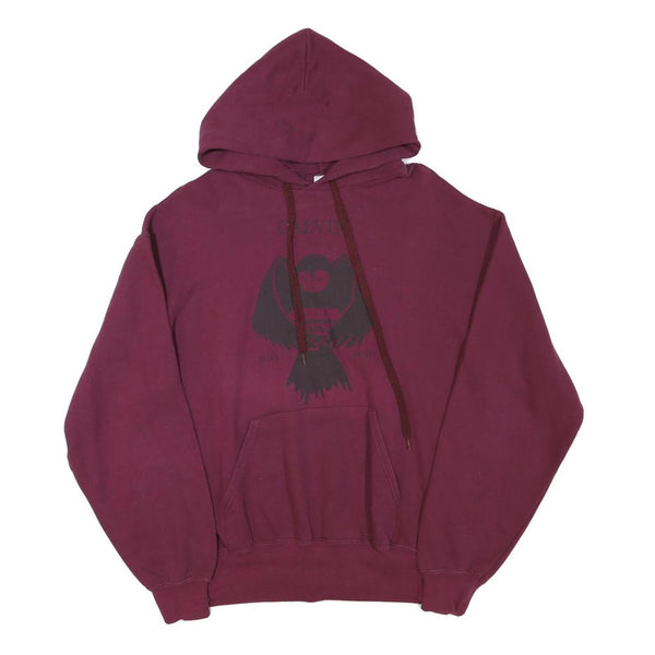This Men's Fruit Of The Loom hoodie comes in a rich maroon colour with a subtle printed graphic on the front featuring an abstract bird design and the text "CALV" above it. The print is tonal and blends into the fabric for a muted look. It has a large kangaroo pocket on the front and an adjustable drawstring hood. The ribbed cuffs and hem provide a snug fit.