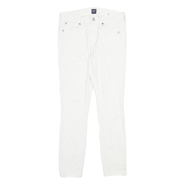 These womens jeans from GAP feature a clean white base with subtle vertical grey pinstripes, offering a stylish yet understated pattern. The slim fit and skinny leg provide a flattering silhouette, perfect for casual or smart-casual wear. Silver-tone rivets add classic denim detailing, enhancing the overall look.