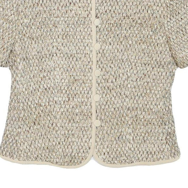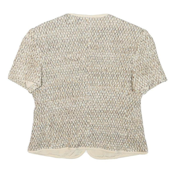 This GIBIERRE DONNA womens jacket features a textured woven fabric in a mix of cream tones, offering a sophisticated and classic look. The smart button closure down the front adds a refined touch, complemented by the neat round neckline and short sleeves. The jacket has a tailored fit which flatters the figure and a slightly cropped length for a stylish silhouette.