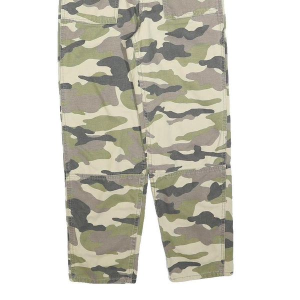 These H&M womens trousers feature a classic camouflage pattern in shades of green, beige, and grey, providing a stylish and versatile military-inspired look. They have a zip closure and prominent front patch pockets adding both functionality and a rugged aesthetic to the design.