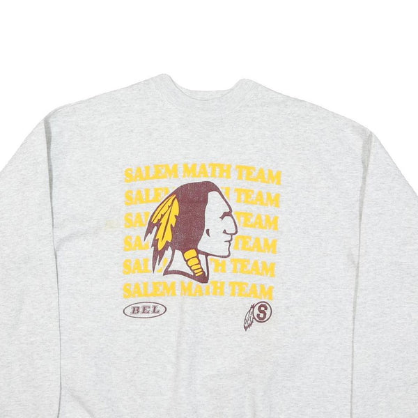 This men's sweatshirt features a light grey base colour with a prominent graphic print on the front showcasing a stylised Native American profile alongside repeated text that reads "Salem Math Team" in yellow. Additional smaller graphic elements appear beneath the main design, adding to the vintage school team style.
